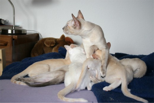 Unsere kleinen Tonkis sind jetzt bereits 6 Monate alt und Paulchen, Pixie, Flower, Pompon und Pax haben uns bereits verlassen. Wir haben uns entschieden, Pretty und Pearl zur Weiterzucht zu behalten. Peach ist reserviert und wird Anfang Dezember nach Holland ziehen. Für Red, unser süsses Red Mink Mädchen, suchen wir noch liebevolle Adoptiveltern. Alle werden mehrfach entwurmt, zweimal gegen Schnupfen/Seuche und Leukose geimpft und erhalten einen FFH-Stammbaum.