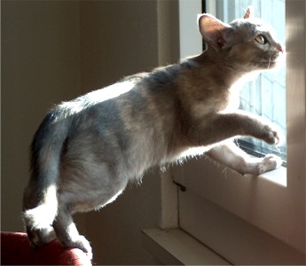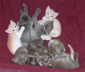 In the winter of 2003 I went to England with a fellow breeder to look at some Tonkinese kittens. At one of the catteries we went to visit, Tyrius Tonkinese, I was totally enchanted by a Blue Tortie Burmese girl. From that moment on I felt that I also would like to have such a sweet tempered and beautiful cat. I searched the websites of English catteries and soon realized, that Blue Tortie is not a color that is seen very often and that a lot of English breeders wouldn't sell abroad and/or for breeding. I also looked at some European breeders but at that point no one seemed to have a Blue Tortie girl.